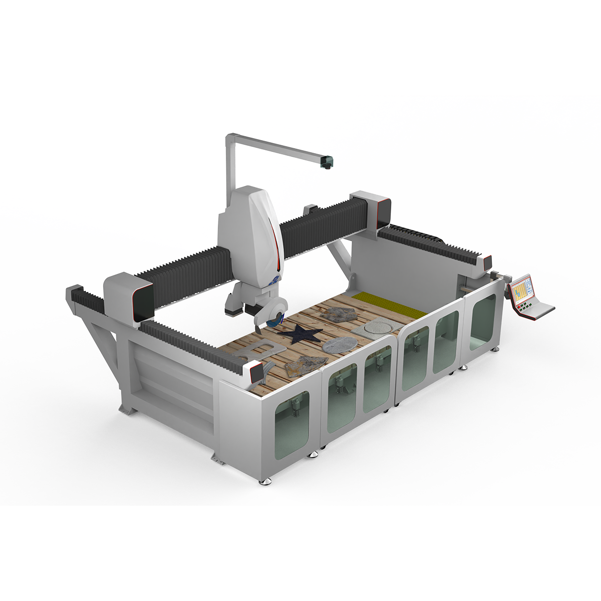The machine boasts comprehensive functionality: Cutting, trimming, edge grinding, chamfering, hole drilling, engraving, and special-shaped modelling capabilities. Effortlessly accomplishes: horizontal/vertical cutting, specification panel cutting, 45-degree chamfering on all four sides of panels, diamond, trapezoidal, circular, fan-shaped, elliptical, polygonal, horse-shoe, L-shaped corner cuts, custom-angle cut-outs for cooktops, profiling, 3D profiling, and edge profiling.